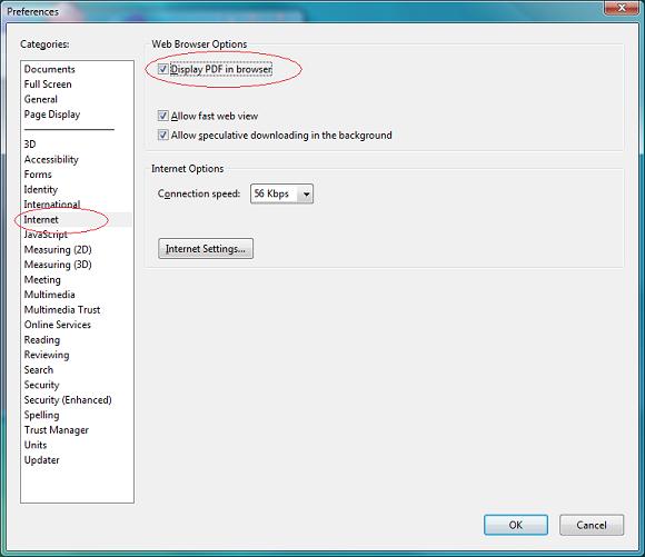 2. Select the Internet menu item, check "Display PDF in browser" and click OK button